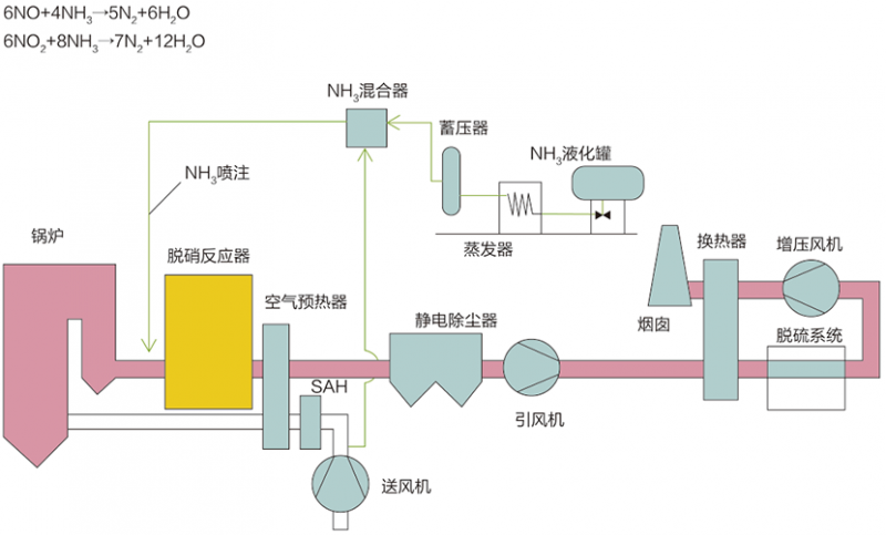 选择性催化还原法(Selective Catalytic Reduction,简称SCR),在一定的反应温度条件下,烟气中的NOx和还原剂NH3在催化剂作用下发生还原反应,生成产物为N2和H2O。