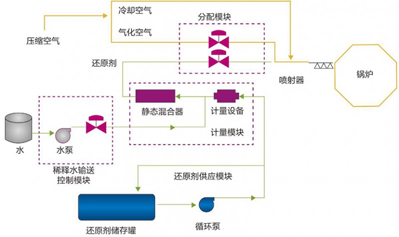 选择性非催化还原法(Selective Non-Catalytic Reduction,简称SNCR),是在不需要催化剂的情况下,将氨基还原剂(尿素/氨水)喷入温度为850~1150℃的烟气中,还原剂有选择性地与烟气中的氮氧化物发生化学反应,使NOx还原生成N2和H2O的方法。